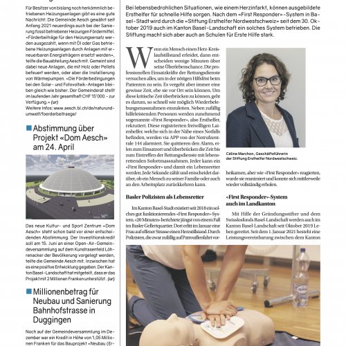 Bei lebensbedrohlichen Situationen, wie einem Herzinfarkt, können ausgebildete Ersthelfer für schnelle Hilfe sorgen. Nach dem «First Responder»-System in Basel-Stadt wird durch die Stiftung Ersthelfer Nordwestschweiz seit dem 30. Oktober 2019 auch im Kanton Basel-Landschaft ein solches System betrieben. Die Stiftung macht sich aber auch an Schulen für Erste Hilfe-Kurse stark.