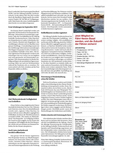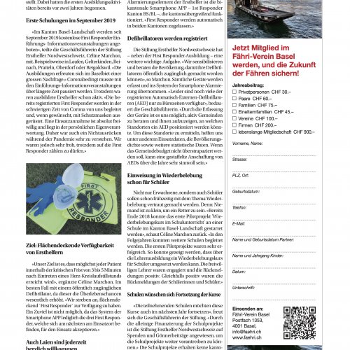 Weiter Infos: Stiftung «Ersthelfer Nordwestschweiz» c/o Kantonsspital Baselland, Rheinstrasse 26, 4410 Liestal, Tel +41 79 857 59 34, www.stiftung-ersthelfer.ch